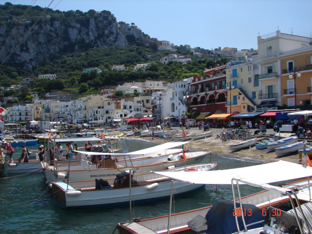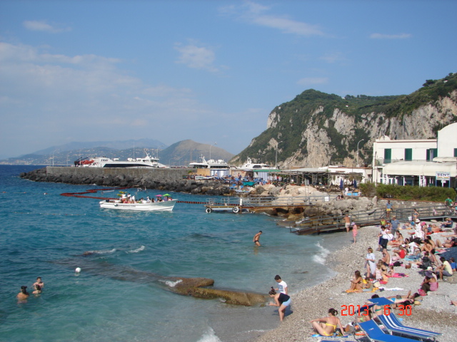 At the marina you will find the tours to the Blue Grotto (Grotta Azzurra), a must see for everyone however, if the tide is high you will not be able to go that day as unfortunately, was our case. Oh well! I guess it just means another trip to Capri in the near future will have to be planned, “oh darn, now that’s a tough decision”. Immediately, you notice people at cafes and restaurants eating fresh seafood and drinking a glass of wine. Just to the right is a small beach and everyone is there dozing off on the sand enjoying that blue sky and sunny day.
